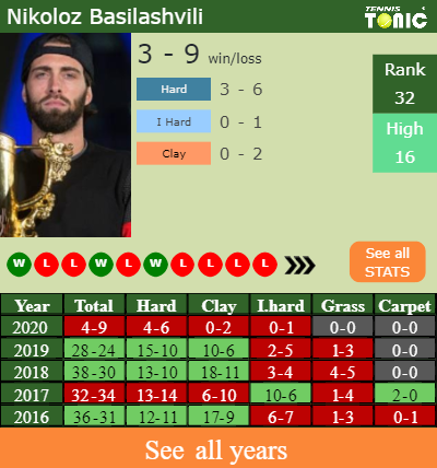 Basilashvili has a 4-9 win-loss record in 2020, 0-2 on clay (See FULL STATS).