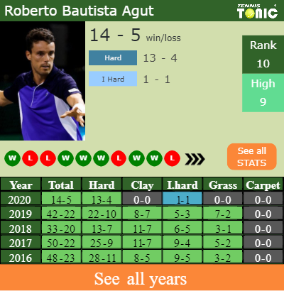 Bautista-Agut has a 14-5 win-loss record in 2020, 0-0 on clay (See FULL STATS).