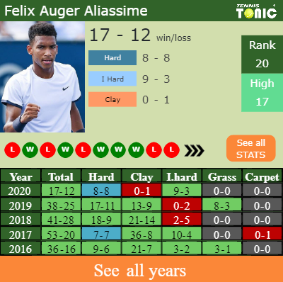 Felix has a 17-12 win-loss record in 2020, 0-1 on clay (See FULL STATS).