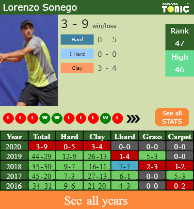 In terms of his career, Sonego has an overall 235-157 record. He has positive 157-92 record on clay.