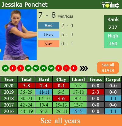 Jessika has a 7-8 win-loss record in 2020, 0-1 on clay (See FULL STATS).