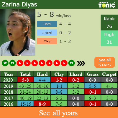Diyas has a positive win-loss record in the last 10 years having won 59% of her matches (275-191). 1-2 on clay in 2020. Regarding her performance on the same surface of this tournament, Diyas has a 29-33 win-loss record in the last years on clay.