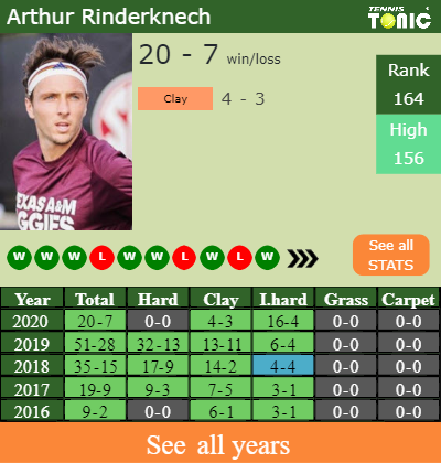 Rinderknech has a 20-7 win-loss record in 2020, 4-3 on clay (See FULL STATS).