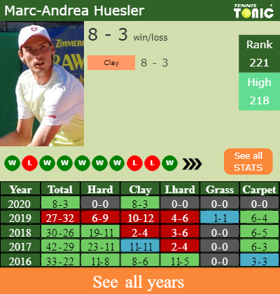 Huesler has a winning record in the last 5 years having won 56% of his matches (140-112). 8-3 on clay in 2020. In connection with his performance on the same surface of this event, Huesler has a 39-36 win-loss record in the last 5 years on clay.