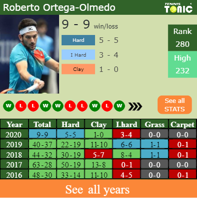 Roberto has a 9-9 win-loss record in 2020, 1-0 on clay (See FULL STATS).