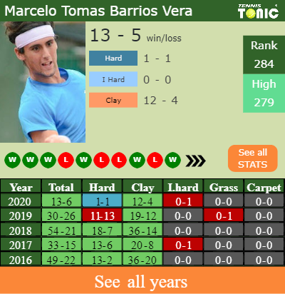 Tomas Barrios Vera has a 13-6 win-loss record in 2020, 12-4 on clay (See FULL STATS).