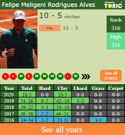 Meligeni Rodrigues Alves has a 10-5 win-loss record in 2020, 10-5 on clay (See FULL STATS).