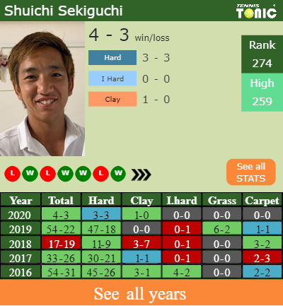 Sekiguchi has a 4-3 win-loss record in 2020, 1-0 on clay (See FULL STATS).