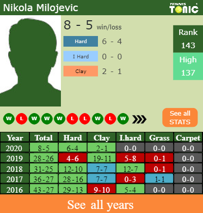 Nikola has a 8-5 win-loss record in 2020, 2-1 on clay (See FULL STATS).