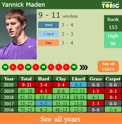 Yannick has a 9-11 win-loss record in 2020, 3-4 on clay (See FULL STATS).