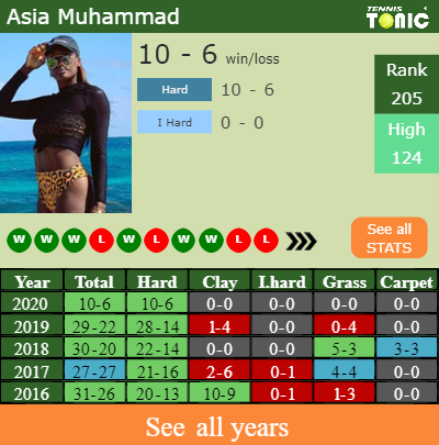 Muhammad has a 10-6 win-loss record in 2020, 0-0 on clay (See FULL STATS).