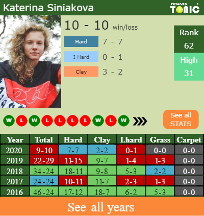 Siniakova has a 9-10 win-loss record in 2020, 2-2 on clay (See FULL STATS).