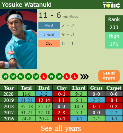 Watanuki has a 11-6 win-loss record in 2020, 0-1 on clay (See FULL STATS).