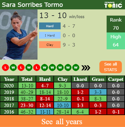 In terms of her career, Sorribes Tormo has an overall 257-180 record. She has positive 158-83 record on clay.