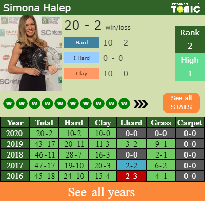The Romanian has a 20-2 win-loss record in 2020, 10-0 on clay (See FULL STATS).