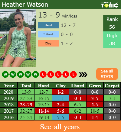 In terms of her career, Heather has an overall 336-263 record. She has positive 51-41 record on clay.