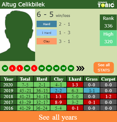 Celikbilek has a 7-5 win-loss record in 2020, 4-1 on clay (See FULL STATS).