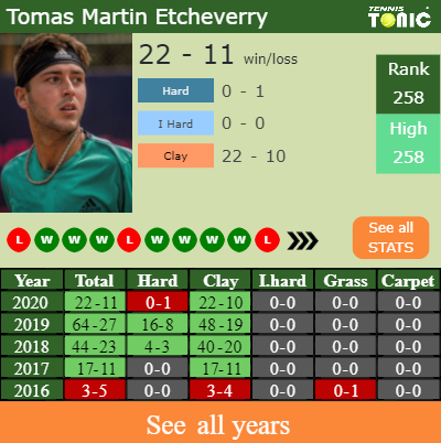 Martin Etcheverry has a 22-11 win-loss record in 2020, 22-10 on clay (See FULL STATS).