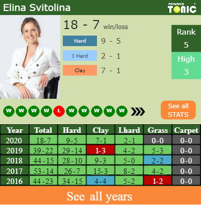 Elina has a 18-7 win-loss record in 2020, 7-1 on clay (See FULL STATS).