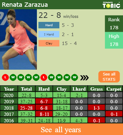 Zarazua has a 22-8 win-loss record in 2020, 15-4 on clay (See FULL STATS).