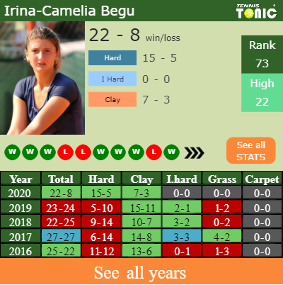 Irina-Camelia has a 22-8 win-loss record in 2020, 7-3 on clay (See FULL STATS).
