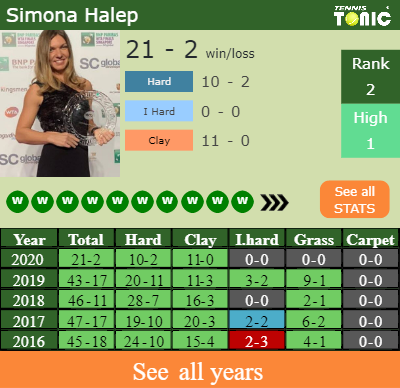 Simona has a 21-2 win-loss record in 2020, 11-0 on clay (See FULL STATS).