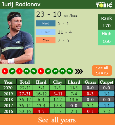 Rodionov has a 23-11 win-loss record in 2020, 7-5 on clay (See FULL STATS).