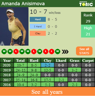 Anisimova has a 10-7 win-loss record in 2020, 2-2 on clay (See FULL STATS).