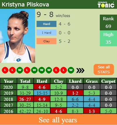 The Czech has a 9-8 win-loss record in 2020, 5-2 on clay (See FULL STATS).