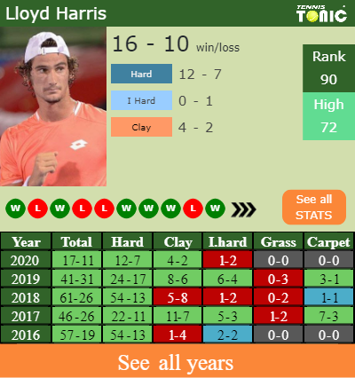 Harris has a 17-11 win-loss record in 2020, 4-2 on clay (See FULL STATS).