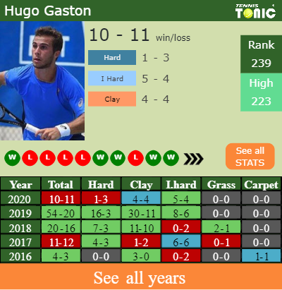 Gaston has a 10-11 win-loss record in 2020, 4-4 on clay (See FULL STATS).