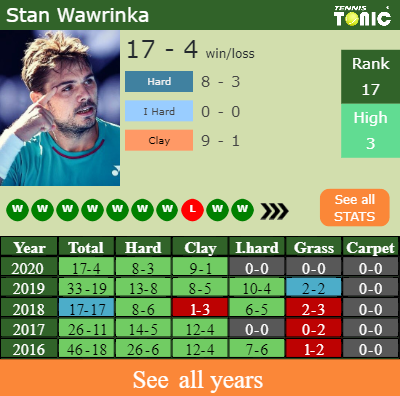 Wawrinka has a solid record in the last 10 years having won 67% of his matches (356-174). 9-1 on clay in 2020. In connection with his performance on the same surface of this competition, Wawrinka has a 115-47 win-loss record in the last years on clay.