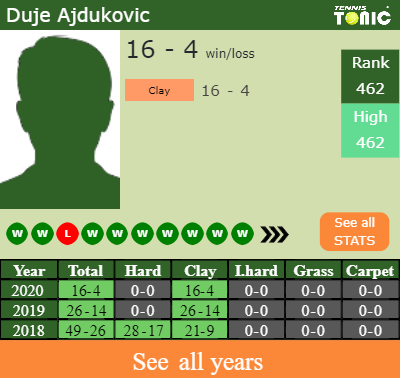 Ajdukovic has a 16-4 win-loss record in 2020, 16-4 on clay (See FULL STATS).