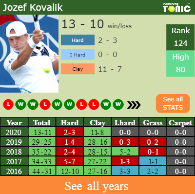 Kovalik has a solid win-loss record in the last 10 years having won 60% of his matches (368-245). 11-8 on clay in 2020. Regarding his performance on the same surface of this tournament, Kovalik has a 273-153 win-loss record in the last years on clay.