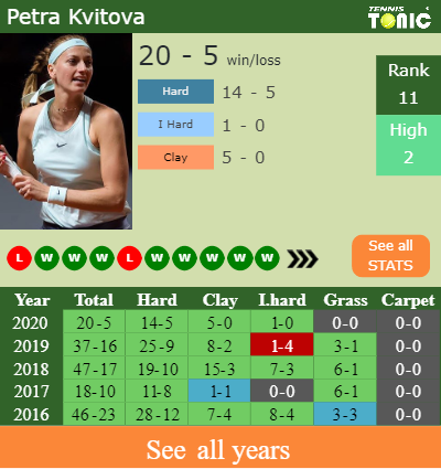 The Czech has a 20-5 win-loss record in 2020, 5-0 on clay (See FULL STATS).