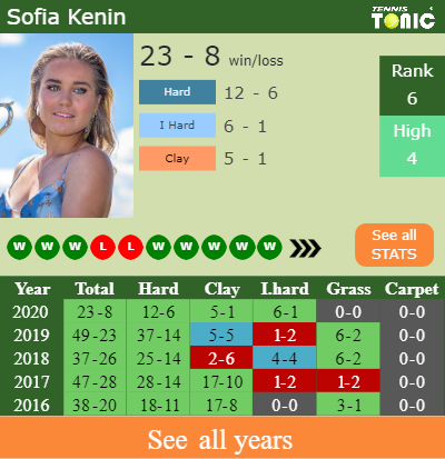 Sofia has a 23-8 win-loss record in 2020, 5-1 on clay (See FULL STATS).