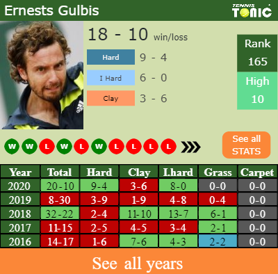 Gulbis has a 20-10 win-loss record in 2020, 8-0 on indoor hard courts (See FULL STATS).