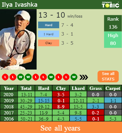 Ivashka has a solid win-loss record in the last 8 years having won 60% of his matches (265-174). 3-2 on indoor hard courts in 2020. Talking about his performance on the same surface of this tournament, Ivashka has a 67-45 record in the last 8 years on indoor hard courts.