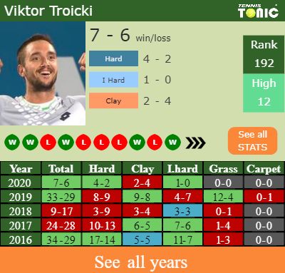Troicki has a 7-6 win-loss record in 2020, 1-0 on indoor hard courts (See FULL STATS).