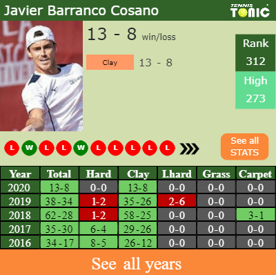 Barranco Cosano has a 13-8 win-loss record in 2020, 13-8 on clay (See FULL STATS).
