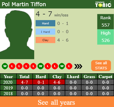 The Spaniard has a 4-7 win-loss record in 2020, 4-6 on clay (See FULL STATS).