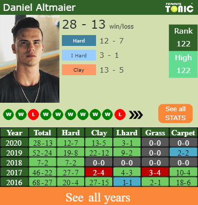 Altmaier has a 28-13 win-loss record in 2020, 3-1 on indoor hard courts (See FULL STATS).