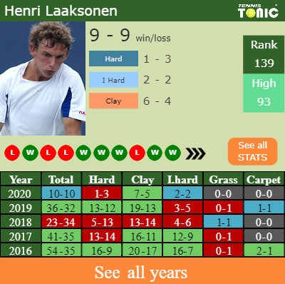 Henri has a 10-10 win-loss record in 2020, 2-2 on indoor hard courts (See FULL STATS).