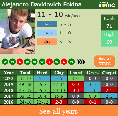 Alejandro has a 11-10 win-loss record in 2020, 1-0 on indoor hard courts (See FULL STATS).