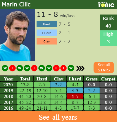 Cilic has a solid win-loss record in the last 10 years having won 67% of his matches (373-187). 4-1 on indoor hard courts in 2020. In connection with his performance on the same surface of this event, Cilic has a 81-38 record in the last years on indoor hard courts.