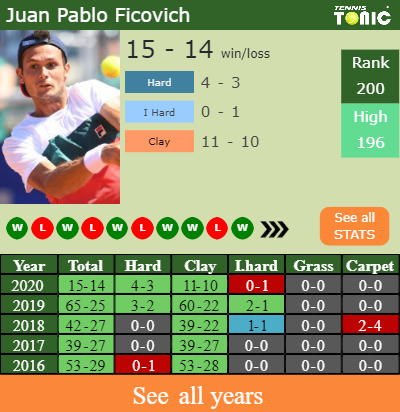 Pablo Ficovich has a solid record in the last 7 years having won 60% of his matches (259-171). 11-10 on clay in 2020. Talking about his performance on the same surface of this competition, Pablo Ficovich has a 243-151 match record in the last 7 years on clay.