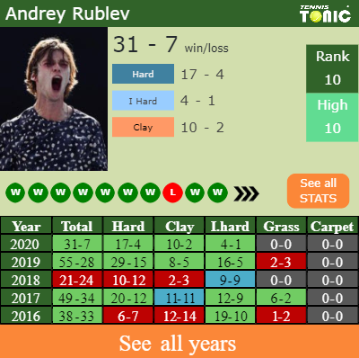 Rublev has a solid record in the last 8 years having won 62% of his matches (282-170). 4-1 on indoor hard courts in 2020. Regarding his performance on the same surface of this competition, Rublev has a 80-48 record in the last 8 years on indoor hard courts.
