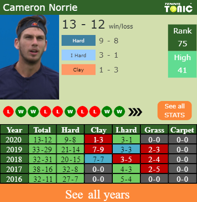 Norrie has a 13-12 win-loss record in 2020, 3-1 on indoor hard courts (See FULL STATS).