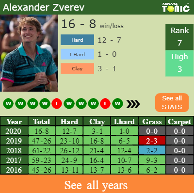 Zverev has a solid match record in the last 8 years having won 65% of his matches (330-180). 1-0 on indoor hard courts in 2020. Regarding his performance on the same surface of this competition, Zverev has a 54-34 win-loss record in the last 8 years on indoor hard courts.