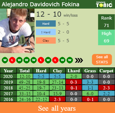 Davidovich Fokina has a 12-10 win-loss record in 2020, 2-0 on indoor hard courts (See FULL STATS).